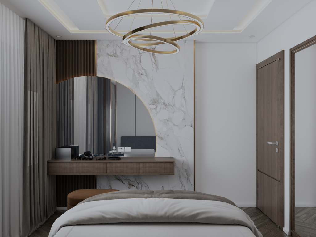 Face au lit, nous avons conçu un espace coiffeuse sur mesure. Une vanité flottante en noyer repose contre un fond en marbre blanc. Un grand miroir semi-circulaire accentue la pierre, ajoutant une touche de géométrie artistique à la pièce.