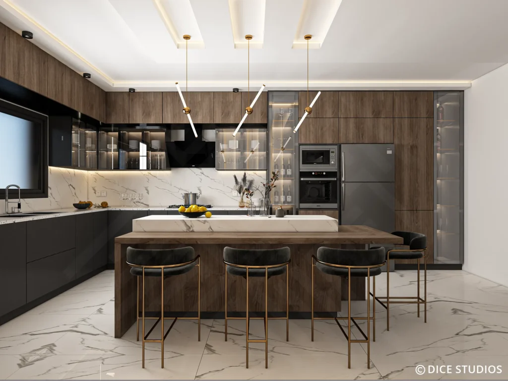 Functional Island & Lighting A central island with a thick marble top serves as the focal point. Above it, striking gold pendant lights add a touch of glamour. Integrated LED lighting in the glass display cabinets highlights the space, proving that a Contemporary Wood Kitchen Design can be both practical and stunning.