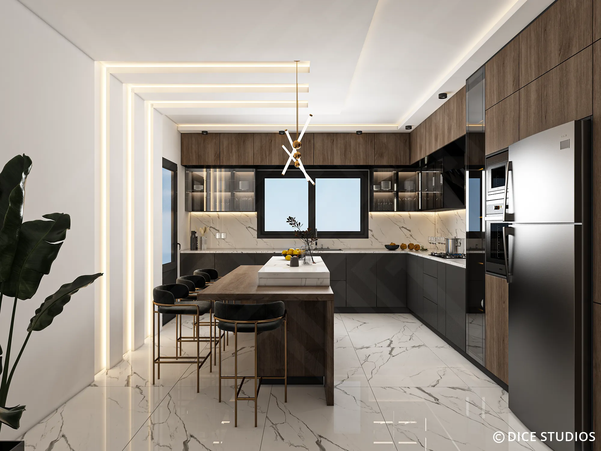 Functional Island & Lighting A central island with a thick marble top serves as the focal point. Above it, striking gold pendant lights add a touch of glamour. Integrated LED lighting in the glass display cabinets highlights the space, proving that a Contemporary Wood Kitchen Design can be both practical and stunning.