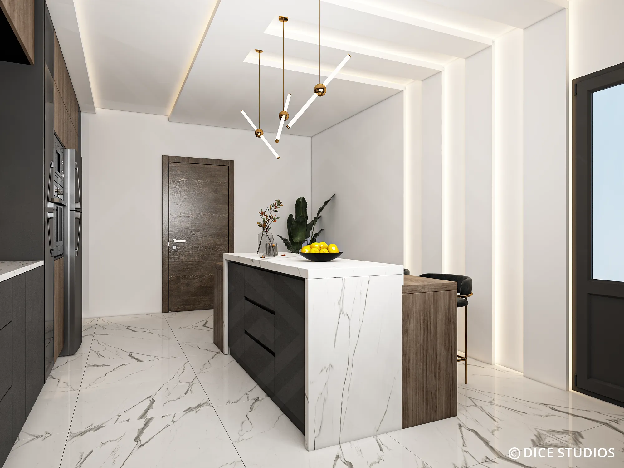 Rich, dark wood cabinetry anchors the room, providing a sense of solidity. This design contrasts the wood with a crisp white marble-effect island and flooring. The interplay of these textures creates a timeless aesthetic.