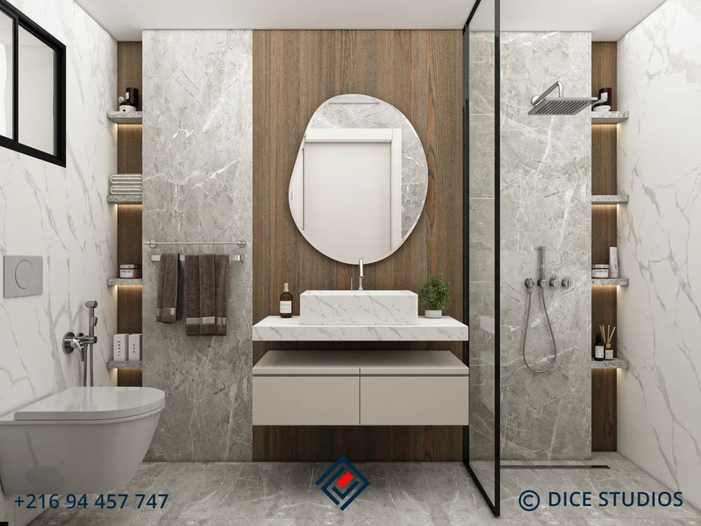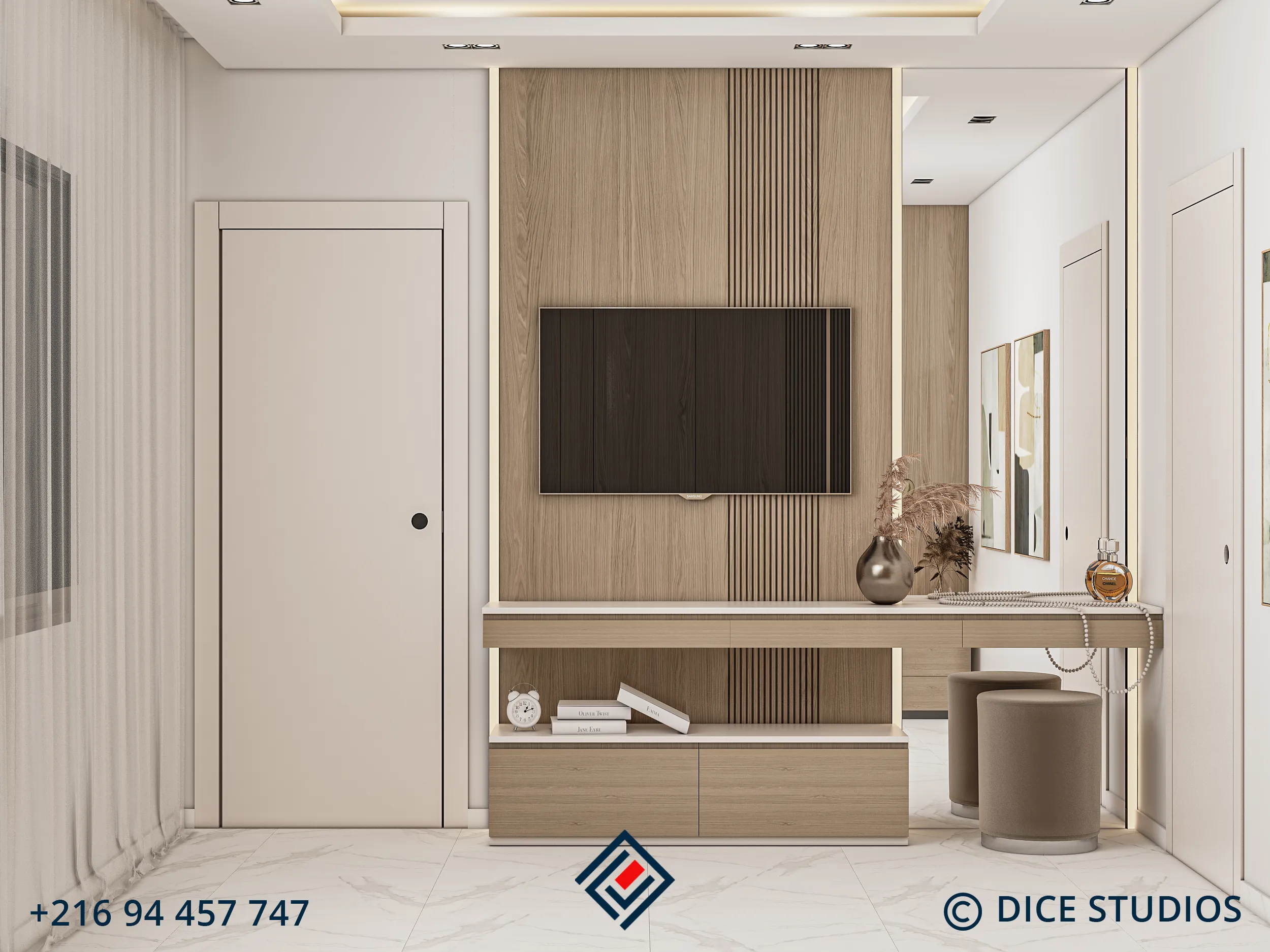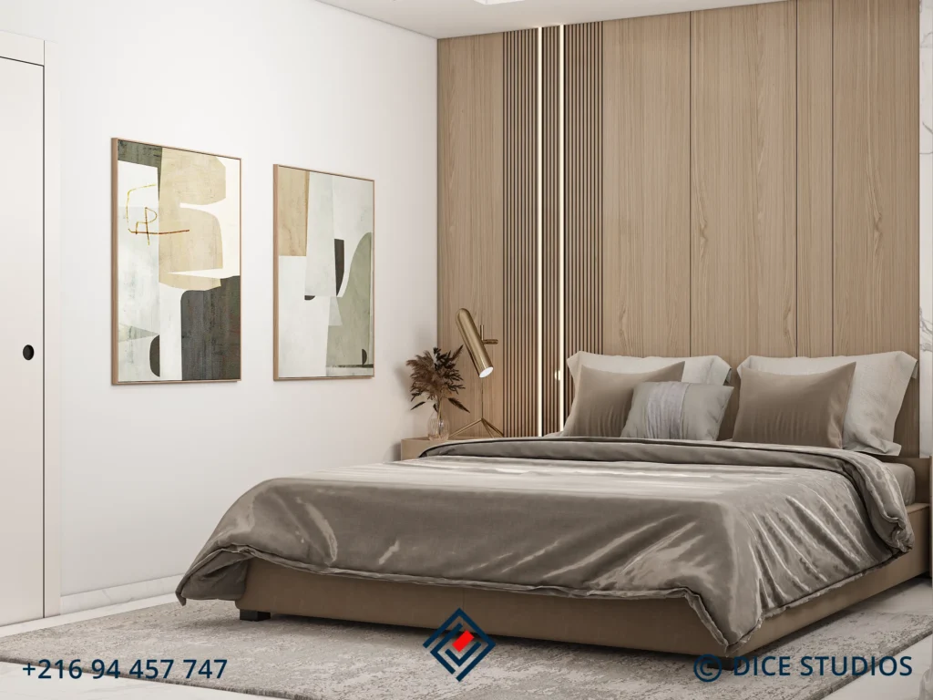 Integrated Design Details The focal point is a custom headboard featuring vertical wood slats and a high-gloss finish, contrasting elegantly with the white marble accents. Opposite the bed, a bespoke media unit merges seamlessly into a vanity desk. This integrated approach ensures the Modern Beige Master Bedroom maximizes storage while maintaining a sleek, airy aesthetic.