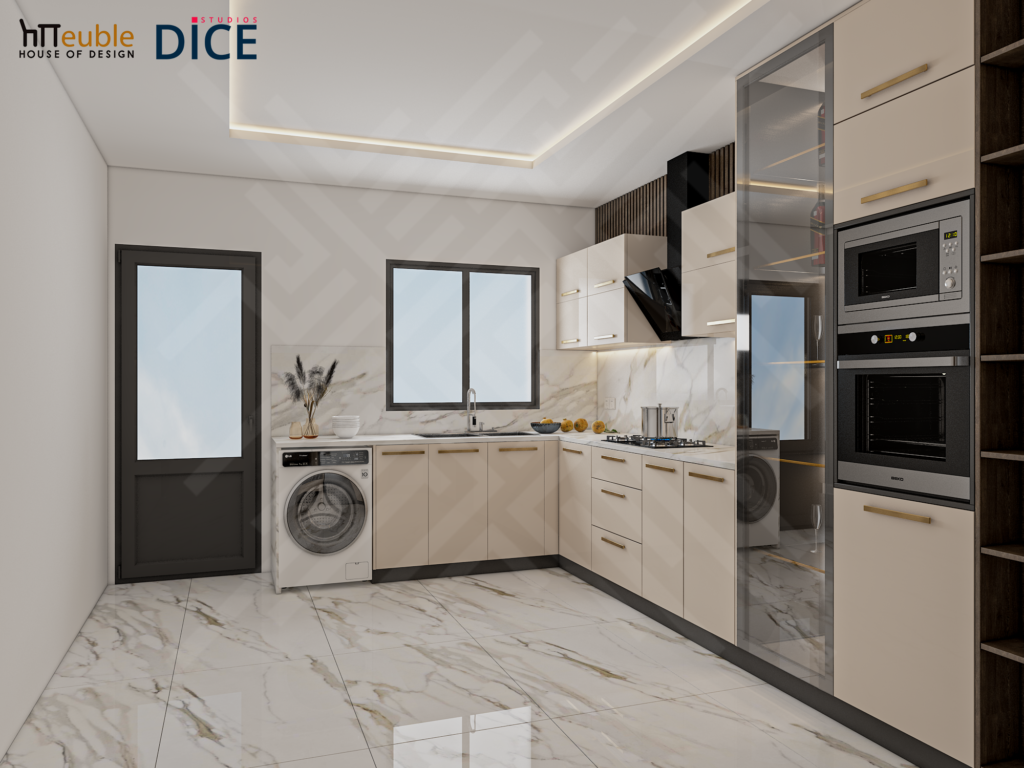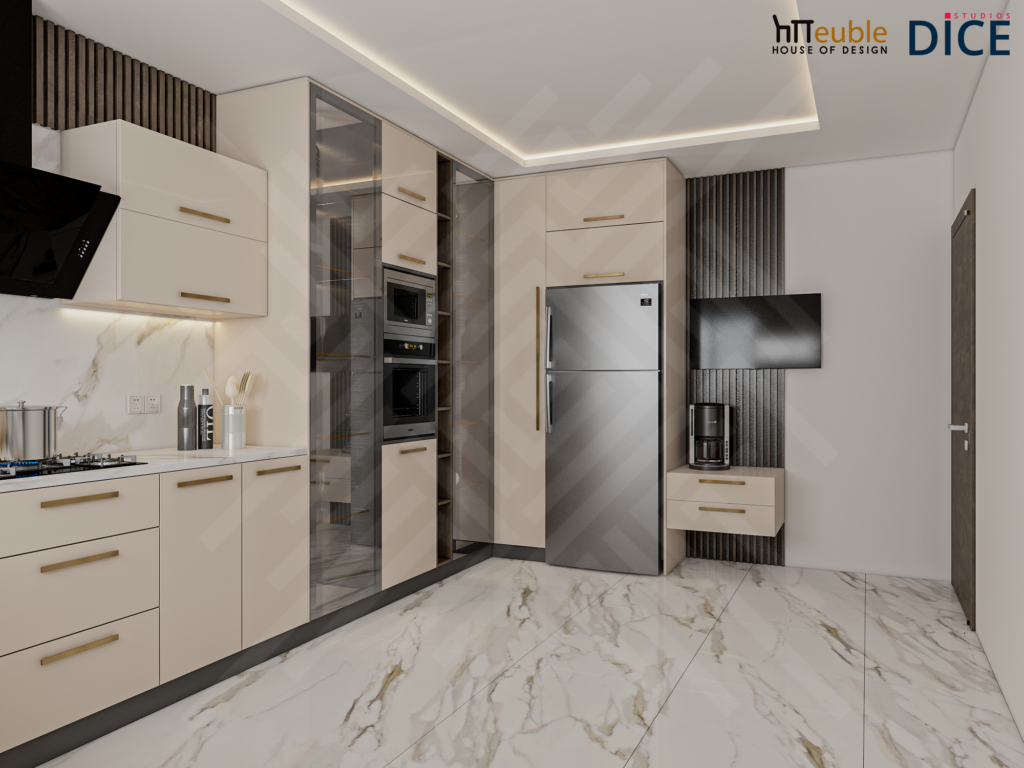 This Modern Luxury Kitchen is a design by DICE ARCHI. We created a bright, elegant space using high-gloss beige cabinetry and gold handles. The design is practical yet stylish. It features illuminated glass display cases for glassware and a durable marble backsplash that matches the floor.