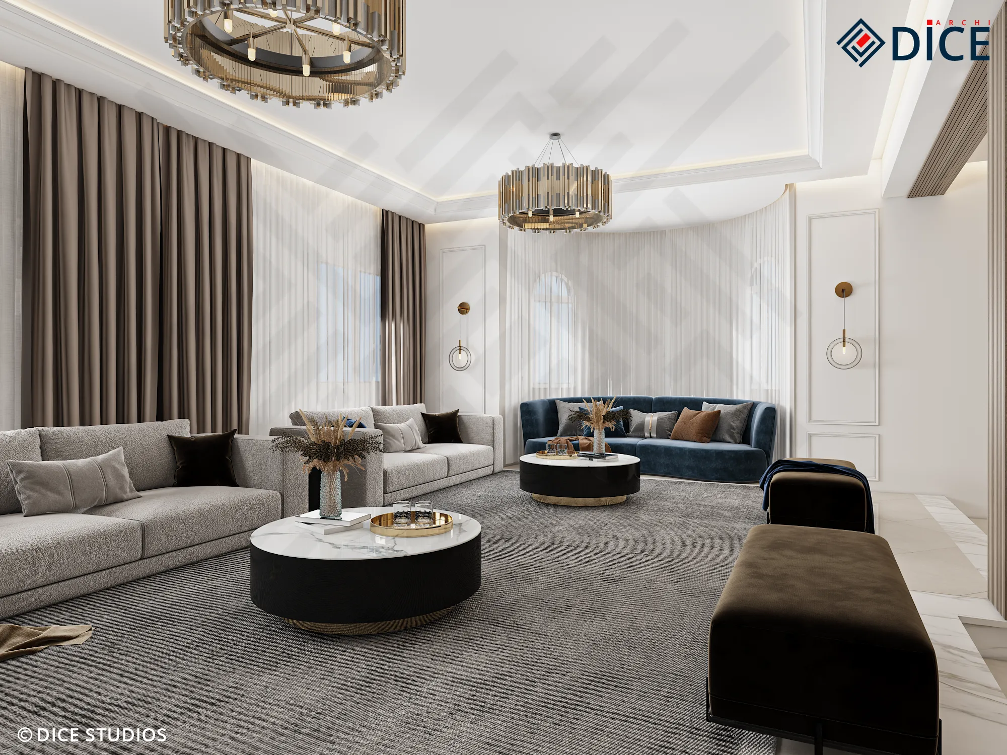 A Centerpiece of Style The lounge is defined by a striking contrast. We paired a curved royal blue velvet sofa with a soft greige sectional to create a dynamic seating arrangement. Nested marble coffee tables and a tiered crystal chandelier add layers of opulence to the Modern Luxury Living Room, ensuring the space feels both grand and inviting.