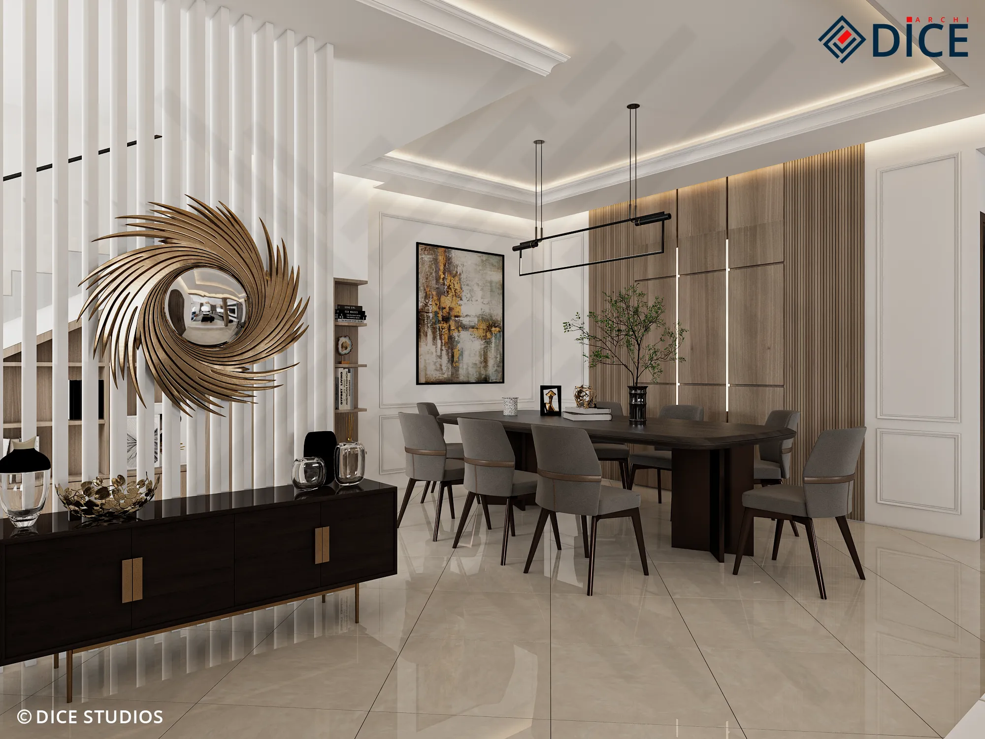Texture and Transition The media wall serves as the architectural anchor, combining black marble with warm wood slats for a dramatic effect. The flow into the dining area remains seamless, separated only by a white slat partition to preserve natural light. A gold sunburst mirror and linear pendant light complete the elegant dining zone. For more on mixing materials, visit Architectural Digest.