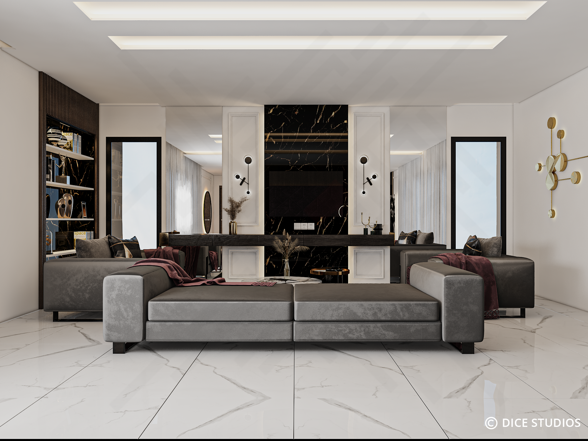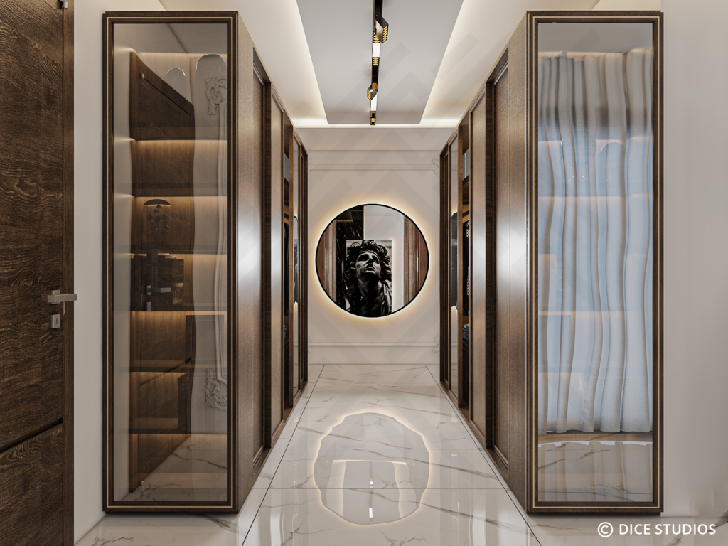 The design centers on a striking headboard wall, where rich plum velvet meets the rigid rhythm of vertical walnut slats. The suite flows seamlessly into a boutique-style dressing area featuring custom glass wardrobes that reflect the polished white marble floors. In the ensuite, the team introduced black marble and gold fixtures to deepen the mood. Ultimately, this project merges the strengths of both studios to create a room of uncompromising luxury.