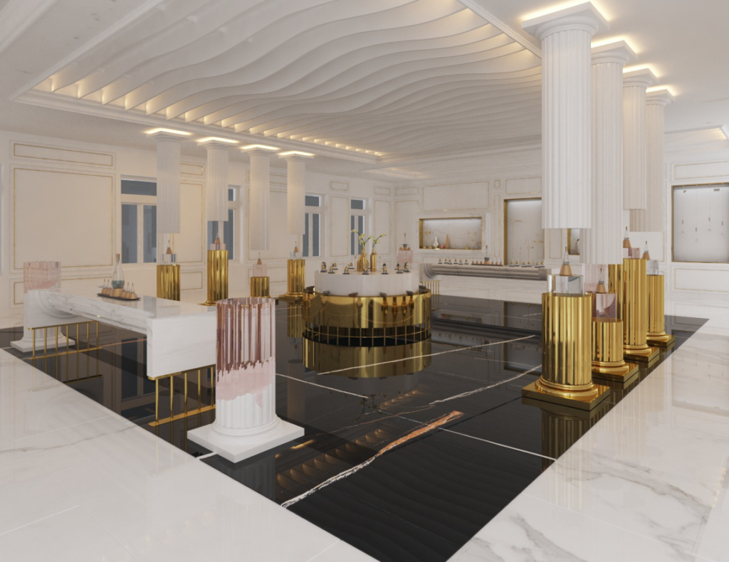 A Dialogue of Eras Furthermore, the design successfully bridges classical and contemporary styles. Massive fluted columns anchor the space, recalling ancient temples. However, the student updated this classical language by integrating modern, transparent display cases into the columns’ bases. Simultaneously, the high-contrast black and white marble flooring creates a sharp geometric pathway. Thus, the floor pattern guides visitors directly toward the central olfactory altar, creating a clear hierarchy of movement.
