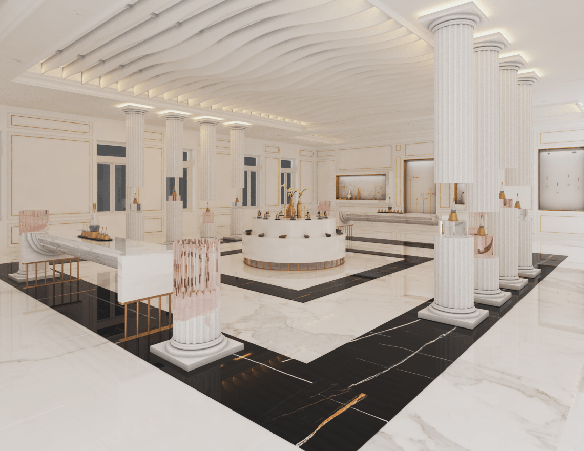 A Dialogue of Eras Furthermore, the design successfully bridges classical and contemporary styles. Massive fluted columns anchor the space, recalling ancient temples. However, the student updated this classical language by integrating modern, transparent display cases into the columns’ bases. Simultaneously, the high-contrast black and white marble flooring creates a sharp geometric pathway. Thus, the floor pattern guides visitors directly toward the central olfactory altar, creating a clear hierarchy of movement.