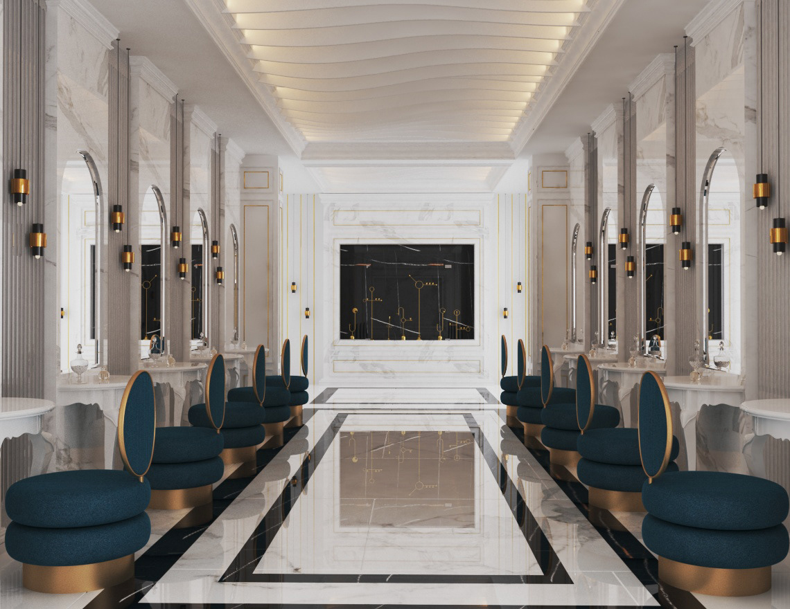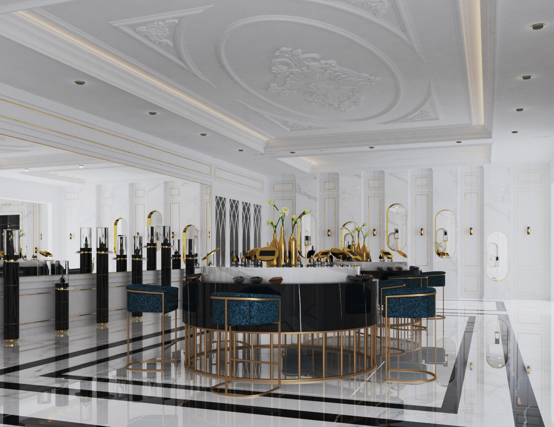 The Temple of Fragrance Ultimately, this space serves as a sanctuary for the senses. The lighting design accentuates the gold details and the texture of the marble, creating an atmosphere of clinical precision mixed with high luxury. Through this collaboration, DICE ARCHI demonstrates how high-end visualization transforms a student’s blueprint into a compelling, photorealistic environment.