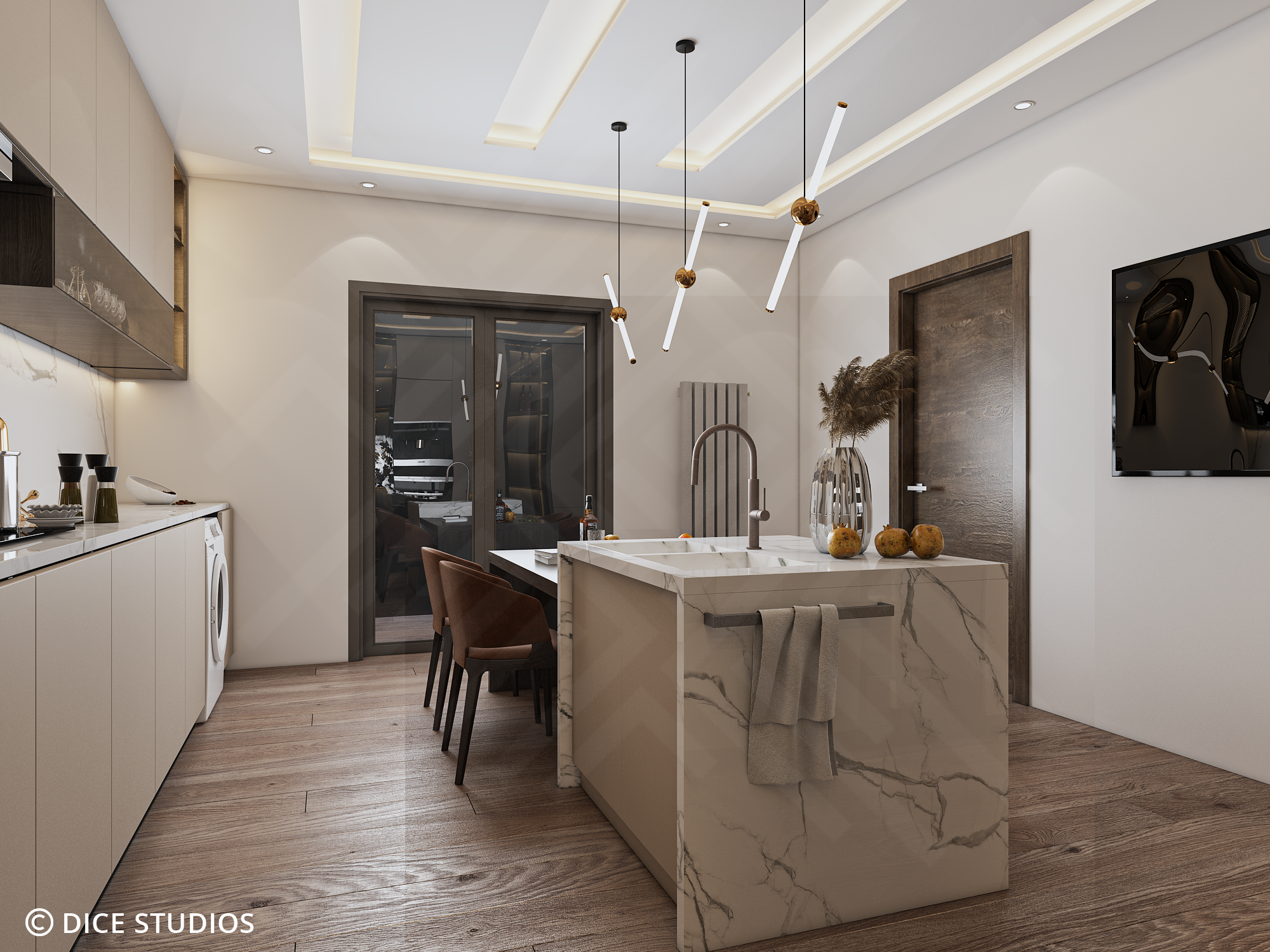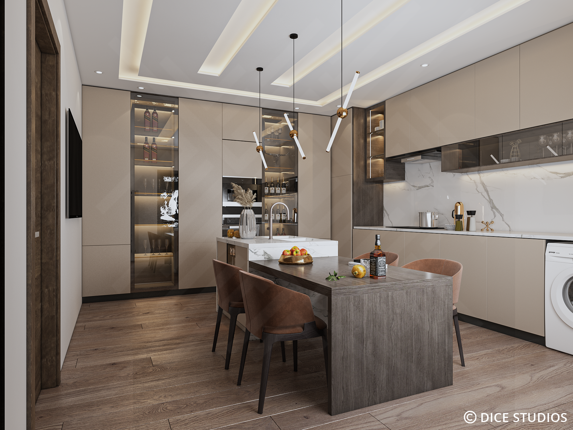 This Modern Warm Kitchen Design is a visualization project by DICE ARCHI. We designed a space for both cooking and socializing.